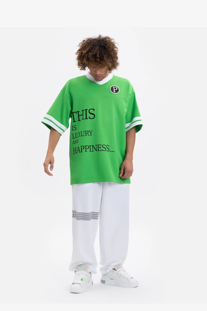 Green has never been so luxurious. This men’s t-shirt in 100% Made in Italy triacetate is an explosion of energy and style. The V-neckline and white stripes on the sleeves evoke the spirit of basketball, while the accessory with the white “P” and the “This is Luxury and Happiness…” print are the seal of a look that doesn’t go unnoticed. For those who want to stand out, with class and attitude.