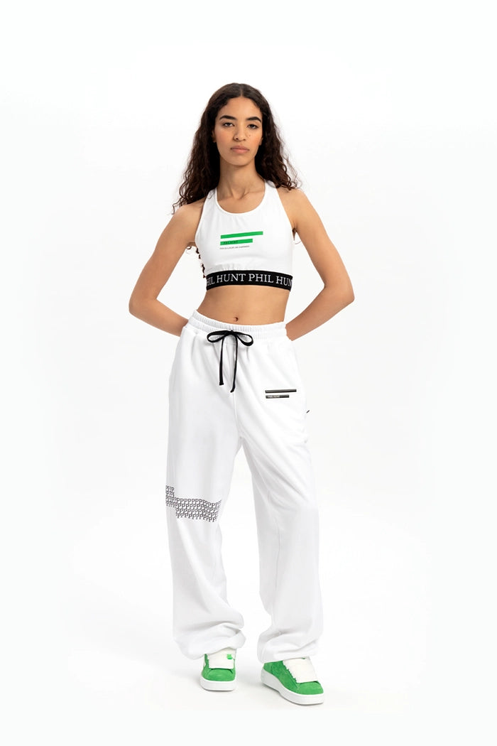 A perfect blend of elegance and energy. This white Phil Hunt stretch top enhances the figure with its snug yet comfortable fit, thanks to its high-quality fabric. The green logo at the center adds a distinctive touch, while the black elastic waistband with the repeated PHIL HUNT branding in white provides support and defines the silhouette. Ideal for those who embrace luxury streetwear with a bold feminine edge.
