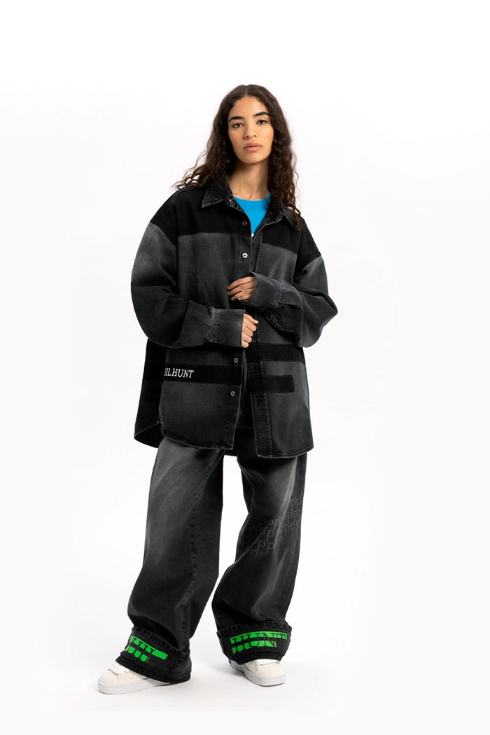 A bold yet sophisticated take on the classic denim shirt. This oversized black model embraces the silhouette with its soft 100% cotton structure, striking the perfect balance between attitude and comfort. The logo print on the chest highlights its exclusive identity, while the branded buttons add a refined touch. Perfect for a contemporary look, whether worn open or closed, seamlessly blending into layered or minimal outfits.