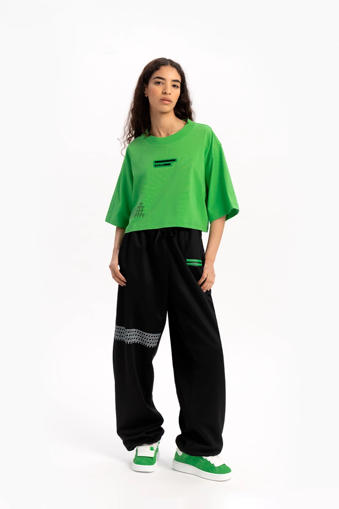 The green women's t-shirt in 100% cotton, Made in Italy, is the expression of a perfect balance between energy and refinement. The logo in the center and the small “p”s on the side add a streetwear touch that doesn't go unnoticed. unnoticed. With its cropped cut, this t-shirt stands out for its freshness and quality, a piece luxury for those who love to get noticed without giving up class.