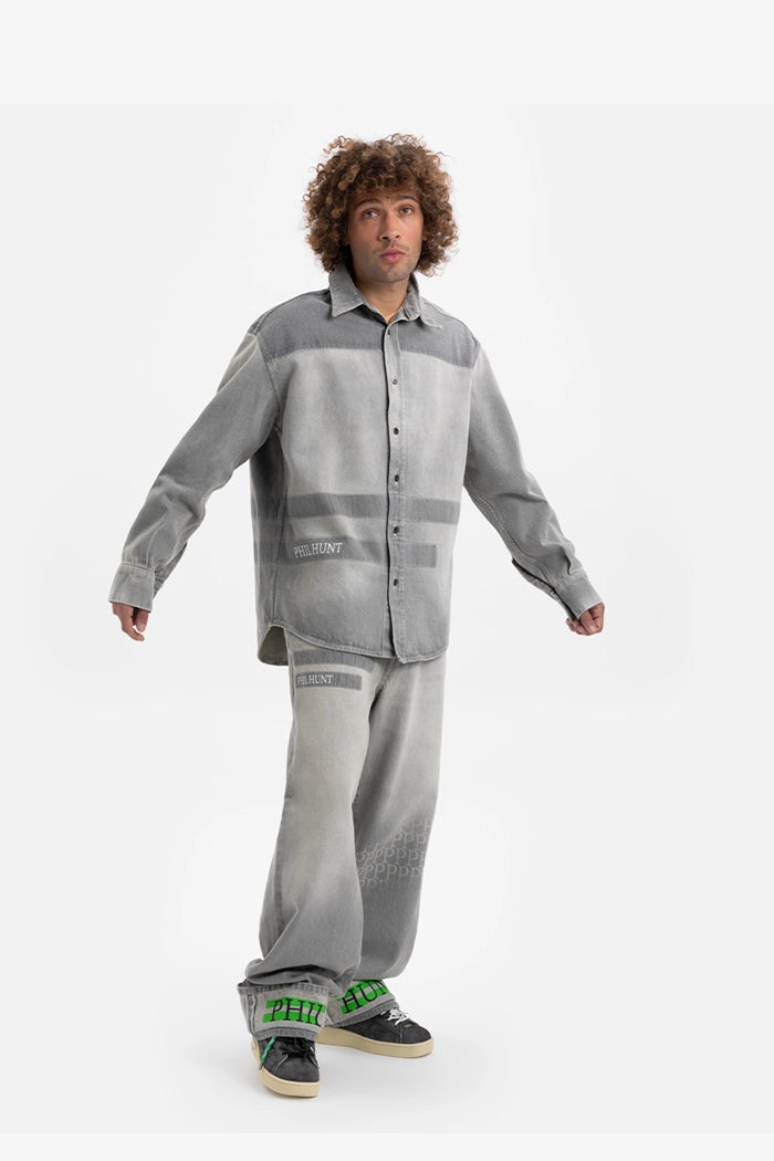 Il denim grigio incontra un design contemporaneo in questi jeans oversize, caratterizzati da una struttura morbida ma decisa. La stampa del logo sul retro e la pioggia di piccole “P” sulla gamba aggiungono profondità visiva, mentre il doppio risvolto con la stampa verde “PHIL HUNT” introduce un elemento di rottura. Un capo distintivo, perfetto per chi ama un look essenziale ma ricco di carattere.