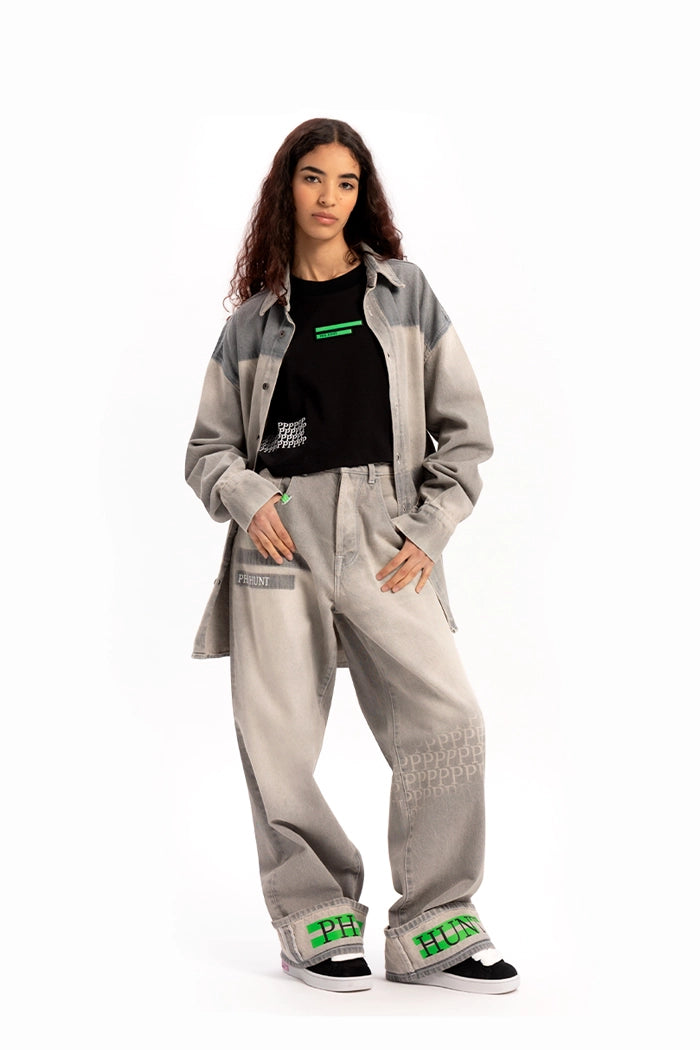 Linee pulite e dettagli distintivi definiscono questi jeans oversize in denim grigio, interamente realizzati in Italia in 100% cotone. Il logo stampato sul retro e la pioggia di piccole “P” lungo la gamba esaltano il DNA del brand, mentre il doppio risvolto con la stampa verde “PHIL HUNT” introduce un contrasto inaspettato. Un capo versatile che fonde sartorialità e spirito streetwear, perfetto per outfit contemporanei.