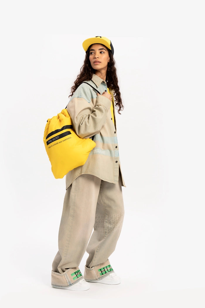 Un capo che unisce lusso discreto e carattere streetwear. Questi jeans oversize in denim beige, realizzati in Italia in 100% cotone, si distinguono per la loro silhouette morbida e i dettagli iconici. La stampa del logo sul retro e la pioggia di piccole “P” lungo la gamba ne rafforzano l’identità, mentre il doppio risvolto con la stampa verde “PHIL HUNT” aggiunge un tocco deciso e contemporaneo.