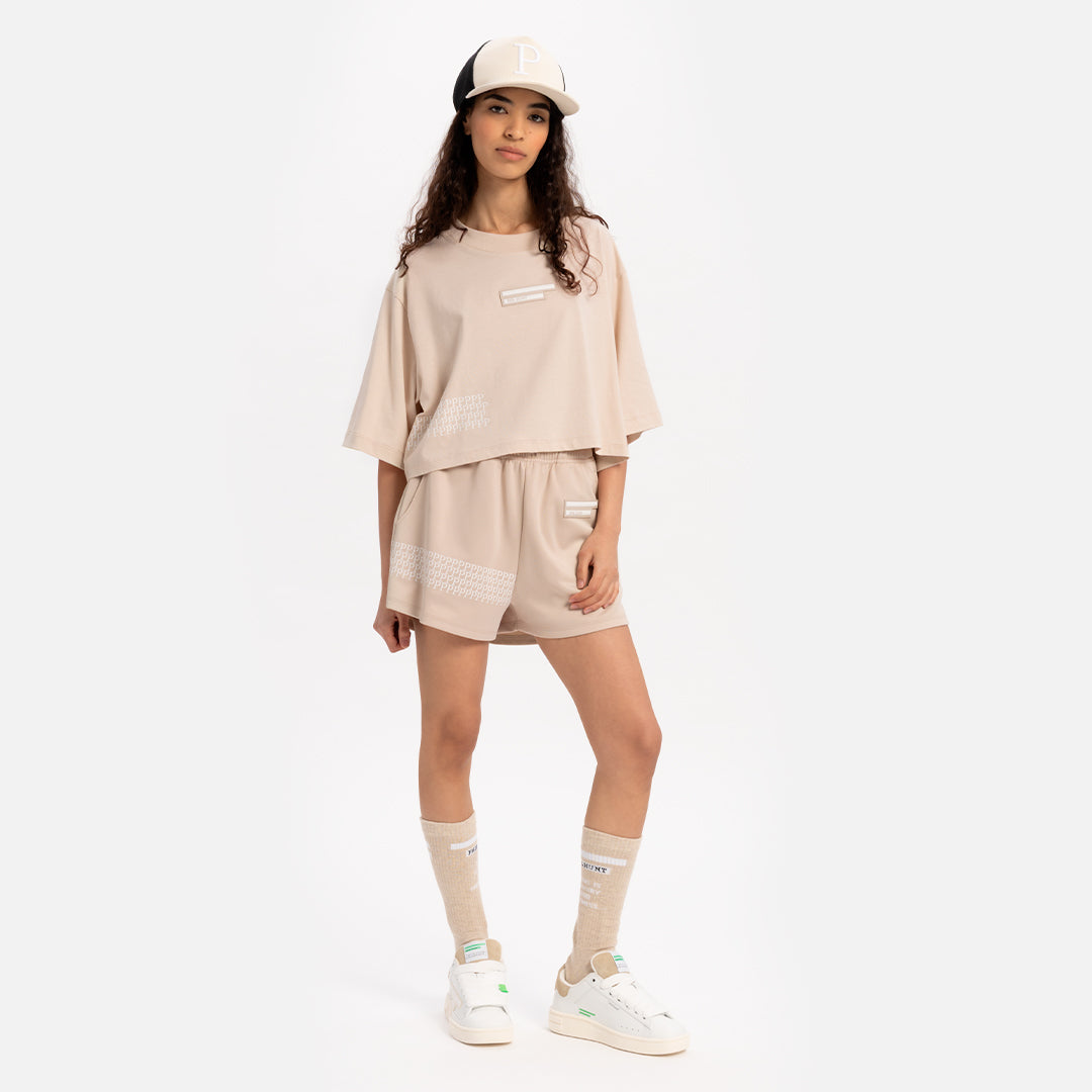 Semplici ma sofisticati, gli shorts da donna beige in triacetato 100% Made in Italy incarnano l’eleganza discreta del lusso streetwear. Il colore neutro li rende estremamente versatili, mentre i dettagli iconici come l’accessorio con il logo Phil Hunt e le piccole “P” su un lato aggiungono un tocco esclusivo. La vita elastica con laccetto regolabile completa il design con funzionalità e stile.